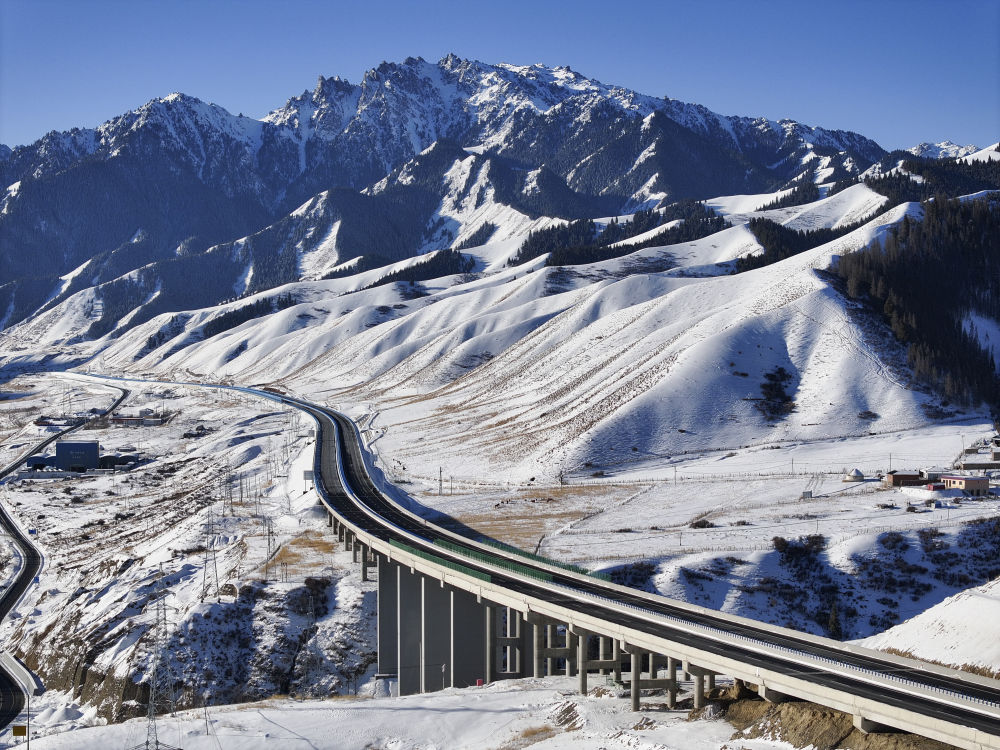 12月下旬,记者驱车从乌鲁木齐前往乌尉高速采访。寒风掠过天山山脊,皑皑白雪覆盖着险峻山群,层峦叠嶂之中,一条大道向前铺展,于天山内部打通条条隧道,在崇山峻岭间架设桥梁。